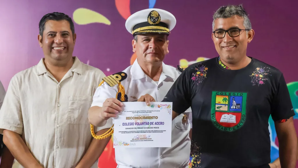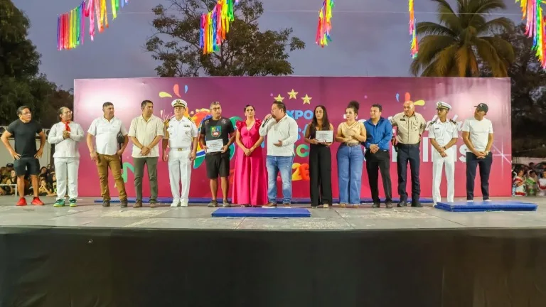 Cd. Lazado Cárdenas, Mich.- En su visita al Teatro del Pueblo de la Expo Fiesta LZC 2026, autoridades municipales presididos por el Presidente Manuel Esquivel Bejarano, llevaron a cabo la premiación del concurso de comparsas que participaron en el desfile inaugural de la Expo Fiesta LZC 2026; siendo la escuela IMCED Las Guacamayas, la ganadora del primer lugar en este certamen.