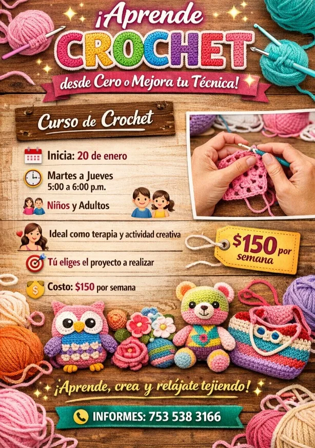 De igual forma, el Centro Comunitario pone a disposición el Curso de Crochet, que dará inicio el 20 de enero, con sesiones los martes, miércoles y jueves, en un horario de 5:00 a 6:00 de la tarde. Este curso está dirigido a niñas, niños y adultos, y se presenta como una alternativa creativa y terapéutica. El costo es de $150 pesos semanales, y permite a las y los participantes elegir el tema que deseen desarrollar. Para mayor información, comunicarse al 753 538 3166.