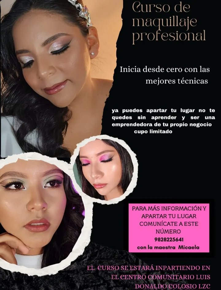 Dentro de la oferta formativa se encuentra el Curso de Maquillaje Profesional, enfocado en la enseñanza de técnicas actuales de maquillaje social y profesional, ideal para personas que desean aprender desde cero y desarrollar habilidades que les permitan emprender su propio negocio. Este curso cuenta con cupo limitado y está dirigido principalmente a principiantes. Para mayores informes e inscripciones, las personas interesadas pueden comunicarse al 982 822 5641, con la maestra Micaela.