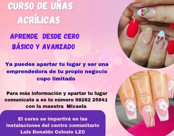 Asimismo, se ofrece el Curso de Uñas Acrílicas, en nivel básico y avanzado, donde las y los participantes aprenderán técnicas profesionales orientadas al autoempleo y al emprendimiento. Este curso también se impartirá en las instalaciones del Centro Comunitario Luis Donaldo Colosio y cuenta con cupo limitado. Para informes e inscripciones, comunicarse al 982 822 5641, con la maestra Micaela.