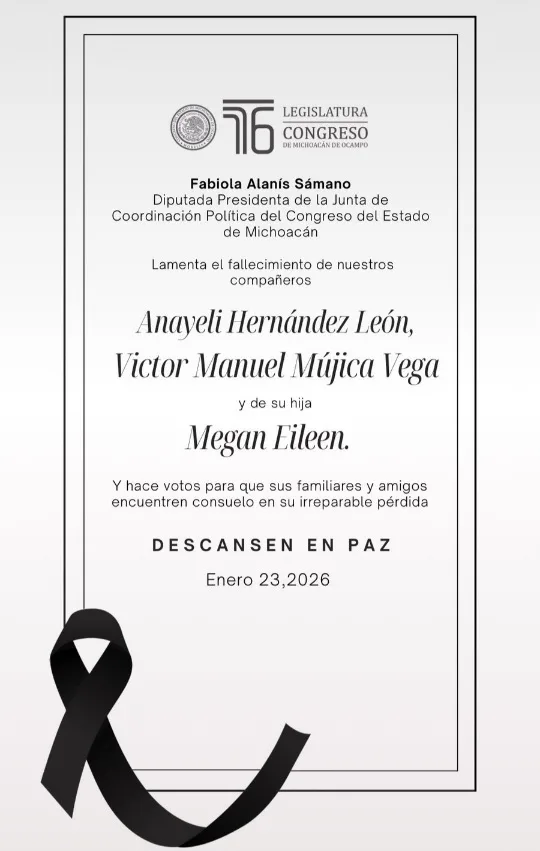 Morelia, Michoacán.- Las y los integrantes, así como el personal de la Junta de Coordinación Política del Congreso del Estado, que preside la diputada Fabiola Alanís, lamentan profundamente la muerte de dos intérpretes de Lengua de Señas Mexicana (LSM) que colaboraban en distintas dependencias, incluido el Poder Legislativo de Michoacán, así como de su hija menor de edad, quienes se encontraban desaparecidos desde el pasado 15 de enero.
