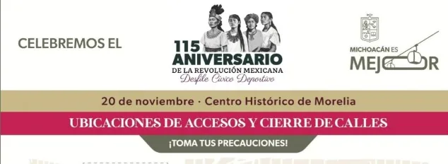 Morelia, Michoacán.- La Secretaría de Seguridad Pública (SSP) informa que a partir de las 00:01 horas del jueves 20 de noviembre iniciarán los cierres vehiculares en calles y avenidas del Centro Histórico de Morelia, con motivo del desfile del 115 Aniversario de la Revolución Mexicana.