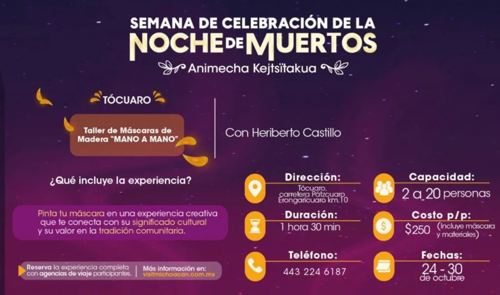 El costo por persona es de 250 pesos, cantidad que ya incluye el material, máscara y pinturas. El taller tiene una duración de una hora y media y se realizará en Tócuaro, en el taller del artesano ubicado en la carretera Pátzcuaro-Erongarícuaro kilómetro 10. Para más detalles, la Sectur Michoacán puso a disposición el teléfono 443 224 6187 y el sitio web https://visitmichoacan.com.mx/
