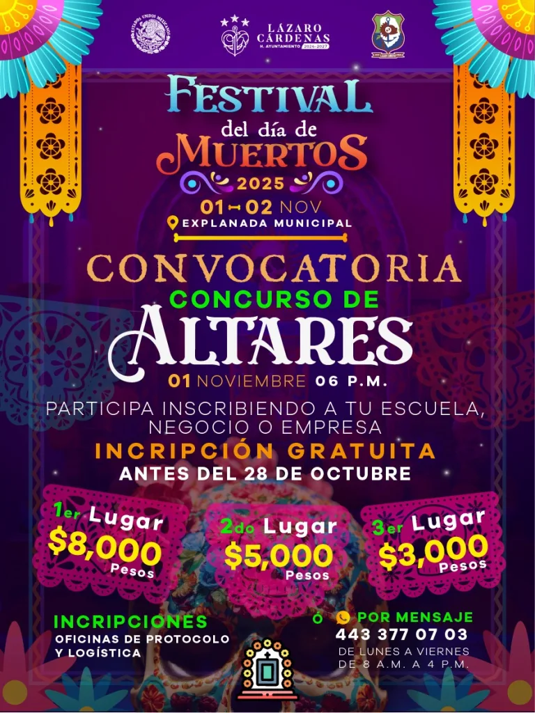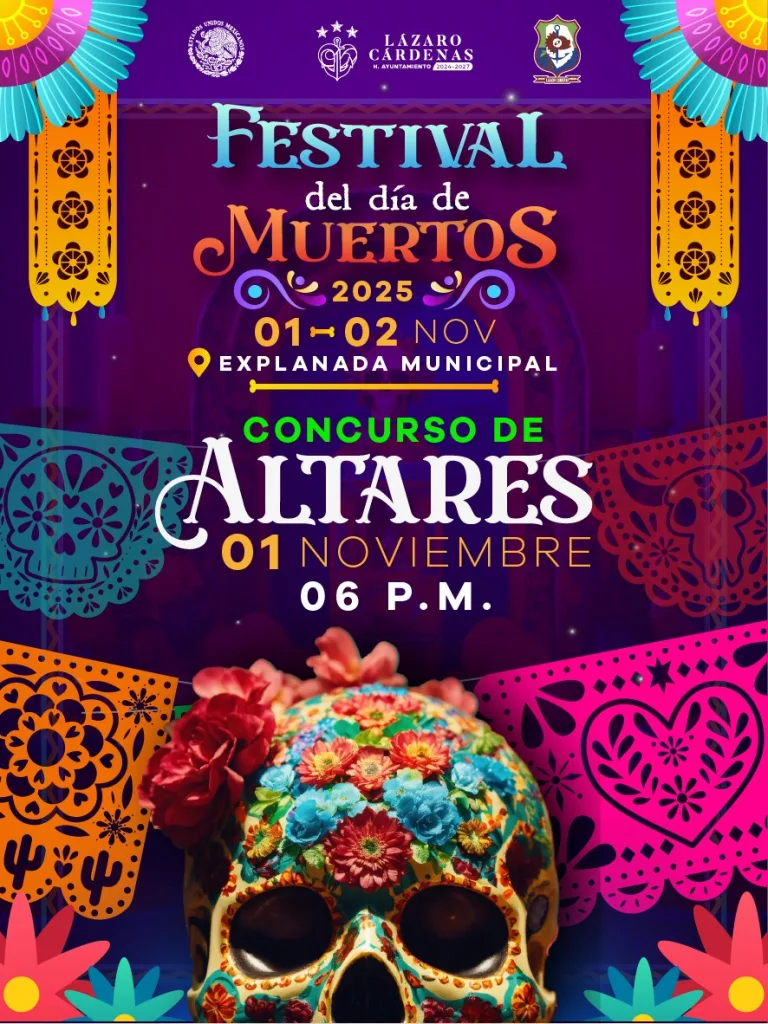 Cd. Lázaro Cárdenas, Mich.– El Gobierno Municipal de Lázaro Cárdenas invita a participar en el Concurso de Altares que se llevará a cabo el próximo 1 de noviembre a las 6:00 de la tarde, como parte del Festival del Día de Muertos 2025, a celebrarse los días 1 y 2 de noviembre en la Explanada Municipal.