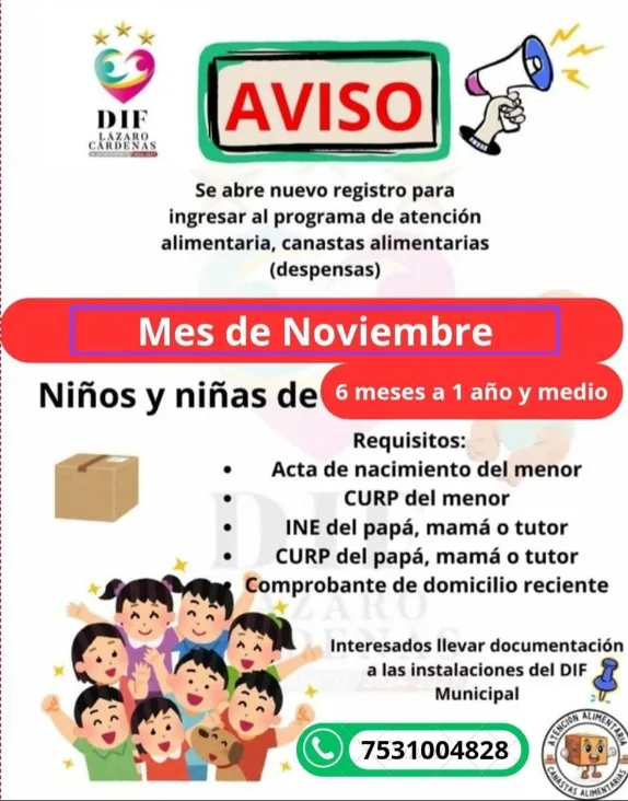 Cd. Lázaro Cárdenas, Mich.- El DIF Municipal anunció la apertura del registro para integrar a niñas y niños de entre seis meses y un año y medio al Programa de Atención Alimentaria, iniciativa que busca apoyar a familias en situación de vulnerabilidad mediante la entrega de canastas alimentarias.