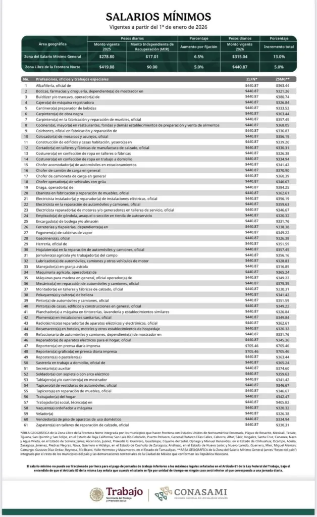 - El salario mínimo general aumentará a 315 pesos diarios en 2026, mientras que los oficios especializados alcanzan hasta 440 pesos al día.