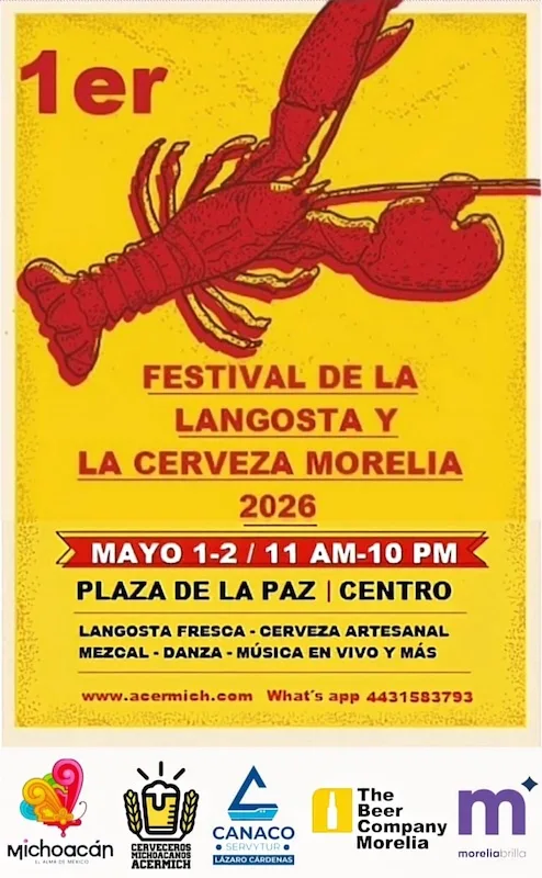 Morelia, Michoacán, 28 de abril de 2026.- El primer Festival de la Langosta y la Cerveza se realizará el 1 y 2 de mayo en la Plaza de la Paz, ubicada en la esquina de la calle Valentín Gómez Farías con la avenida Nocupétaro de la capital michoacana, informó la Secretaría de Turismo de Michoacán (Sectur), dependencia dirigida por Roberto Monroy García.