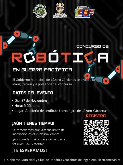 Cd. Lázaro Cárdenas, Mich.– A tan solo unos días de su realización, Lázaro Cárdenas se encuentra listo para recibir a los participantes en el Concurso de Robótica “En Guerra Pacífica”, un evento que marca un momento importante para la región y que será albergado en el Auditorio del Instituto Tecnológico de Lázaro Cárdenas el próximo 27 de noviembre a las 9:00 horas.