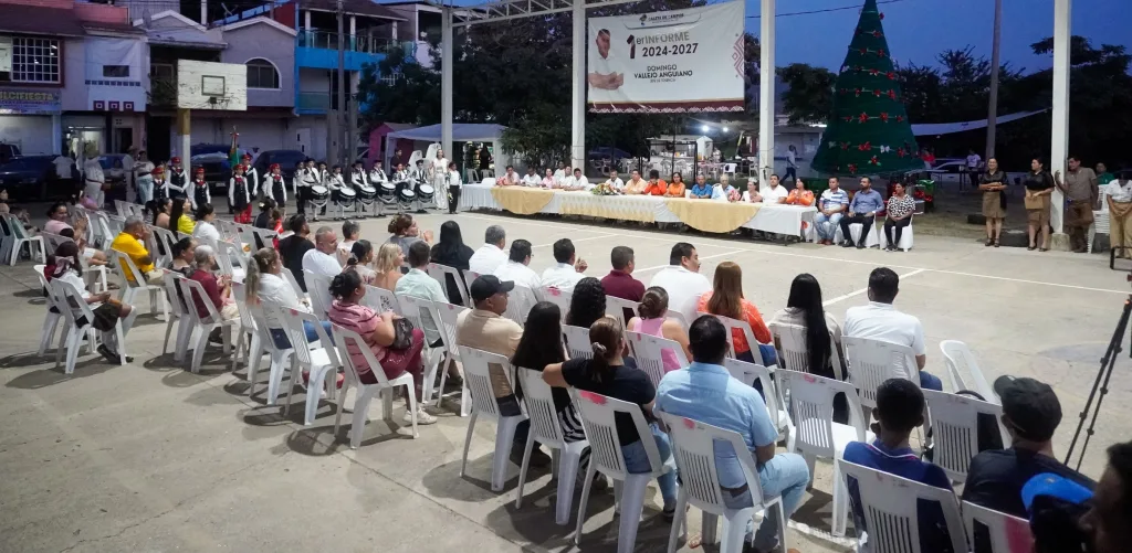 Después de un recorrido para atestiguar las diferentes obras que actualmente se impulsan en la tenencia; el Alcalde y funcionarios municipales acompañaron a Domingo Vallejo Anguiano en la ceremonia de su primer informe de actividades correspondiente al segundo periodo, y en el que dio a conocer la mejora de infraestructura en cuatro escuelas de la localidad; siendo la construcción de la techumbre en la Esc. Prim. “Reivindicación Petrolera” una de las más importantes, con una inversión total de más de 4 millones de pesos.