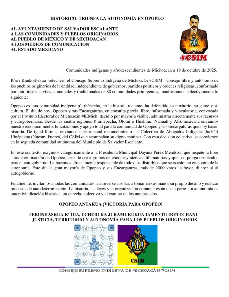 En un pronunciamiento dirigido al Ayuntamiento de Salvador Escalante, a los pueblos originarios, a los medios de comunicación y al Estado mexicano, el CSIM —consejo libre y autónomo integrado por autoridades civiles, comunales y tradicionales de 80 comunidades— calificó el resultado como “histórico” y extendió su reconocimiento, felicitación y apoyo total a Opopeo y a sus encargaturas.