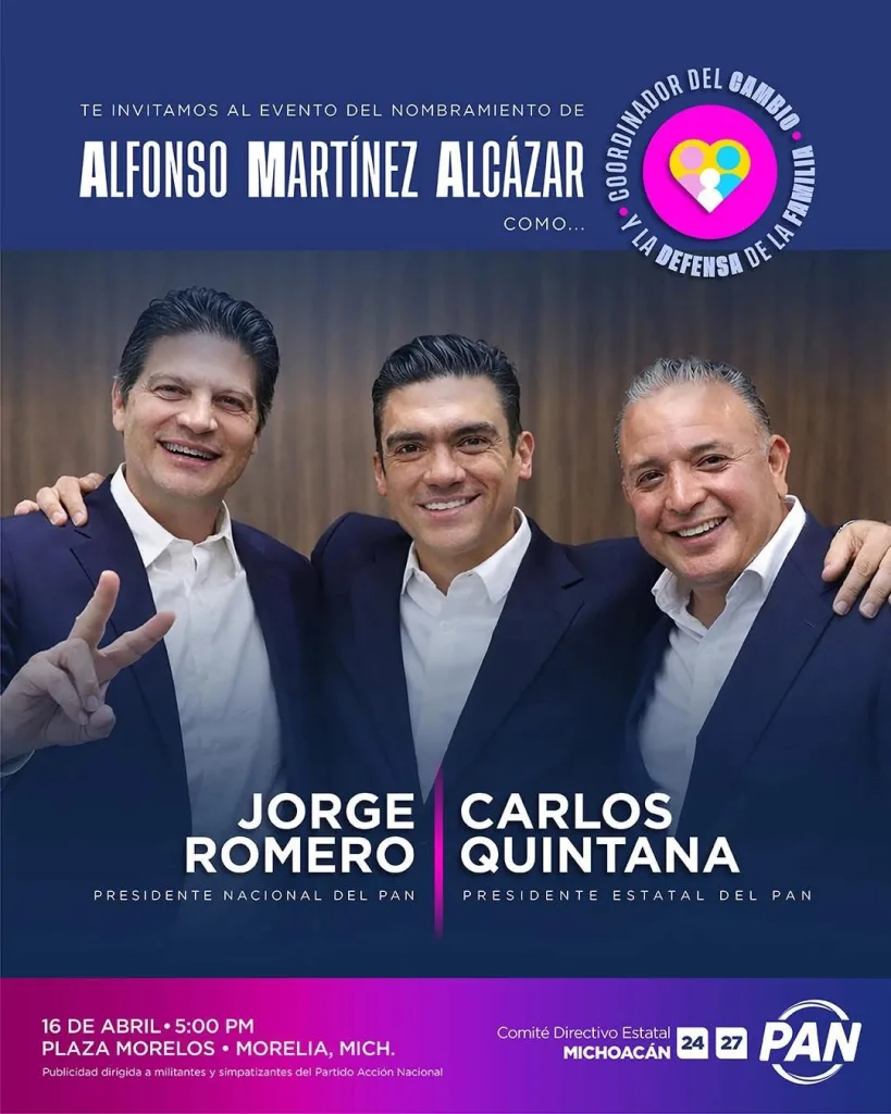 Michoacán. — El Partido Acción Nacional (PAN) en Michoacán anunció el inicio de una nueva etapa organizativa con el nombramiento de Alfonso Martínez Alcázar como coordinador estatal del cambio y la defensa de la familia.