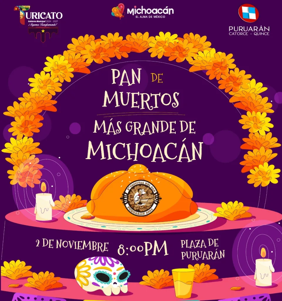 Hernández Arreola destacó que una de las actividades más esperadas es la presentación del pan de muerto más grande de Michoacán, que el año pasado estuvo formado por más de dos mil piezas elaboradas por los panaderos de Puruarán y que se monta con la participación de todo el pueblo, para después ser repartido entre las y los asistentes, sin faltar la taza de chocolate también elaborado por manos puruarenses.