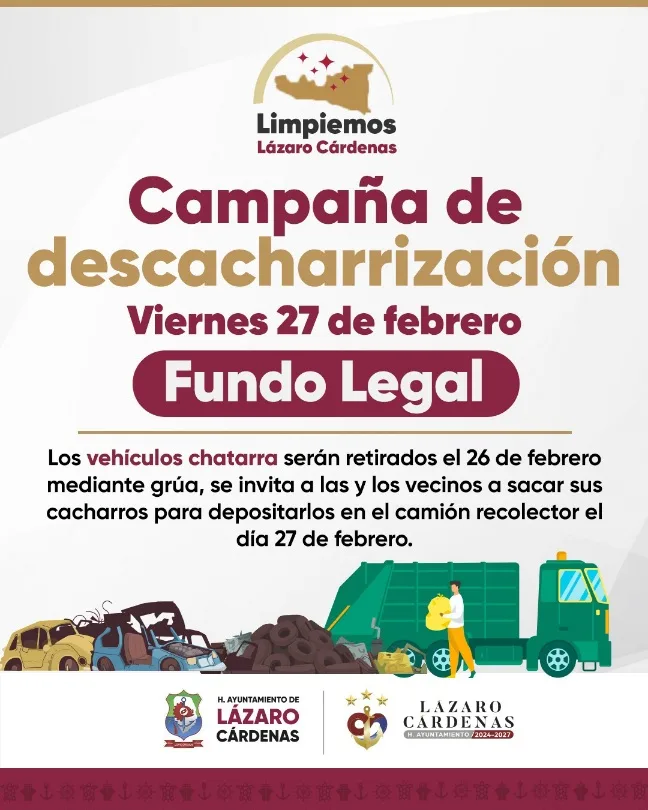 Cd. Lázaro Cárdenas, Mich.- Como parte de las acciones para fortalecer la limpieza y el orden en el municipio, el Gobierno de Lázaro Cárdenas llevará a cabo una Campaña de Descacharrización en el Fundo Legal, programada para el próximo viernes 27 de febrero.