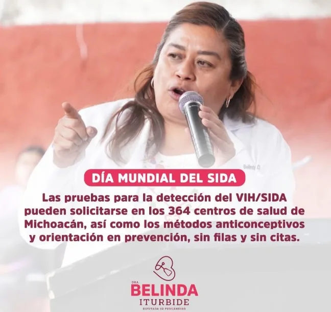 Morelia, Michoacán.- Luego de reconocer el trabajo del Gobierno de Michoacán con 145 mil pruebas de detección gratuita de VIH/SIDA en lo que va del año, la diputada de Morena, Belinda Iturbide Díaz conminó a qué instituciones gubernamentales, personal de salud y sociedad en general trabajen conjuntamente para lograr “Cero muertes por SIDA en 2030”.
