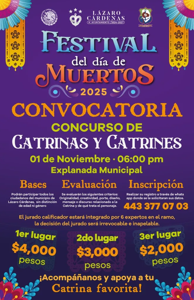 Cd. Lázaro Cárdenas, Mich.- El Gobierno Municipal de Lázaro Cárdenas recordó a la ciudadanía que están por concluir las inscripciones para participar en el Concurso de Catrinas y Catrines, que se realizará el próximo 1 de noviembre a las 6:00 de la tarde en la Explanada Municipal, como parte del Festival del Día de Muertos 2025.