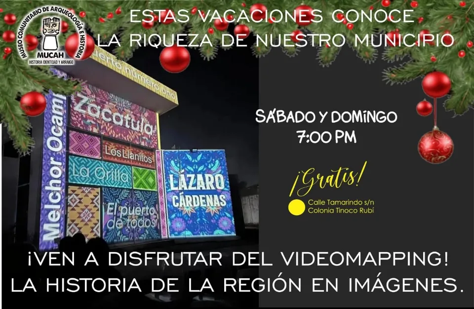 Cd. Lázaro Cárdenas, Mich.- El Museo Comunitario de Arqueología e Historia (MUCAH) mantiene abierta sus puertas en estas vacaciones decembrinas, e invita a las familias a disfrutar este sábado y domingo de una experiencia visual única: la proyección del video mapping nocturno, programado a las 7:00 de la tarde, un espectáculo que rescata, narra y proyecta la riqueza histórica y cultural del municipio.